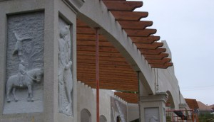 Imagen provisional que pertenece al pórtico privado de un establo en construcción. Del pórtico, son obra escultórica un total de 14 relieves que tienen como motivo central el caballo.